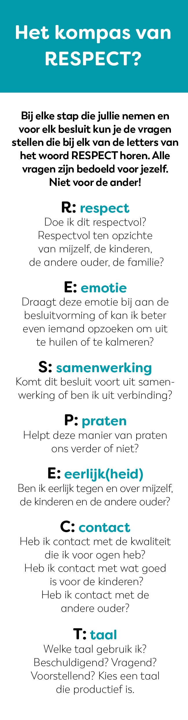 Het Kompas geeft handvatten om Respectvol te luisteren, te praten, met jullie beider emoties om te gaan en om in contact te blijven.